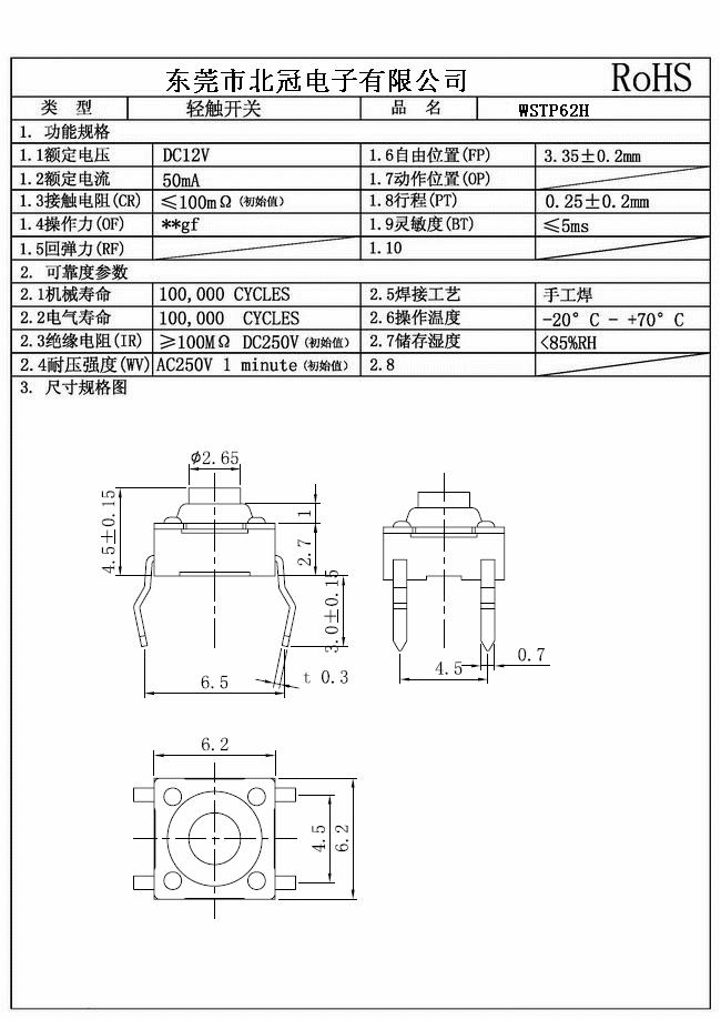 3.Lnsulation Resistance: ≥100mΩ DC250V