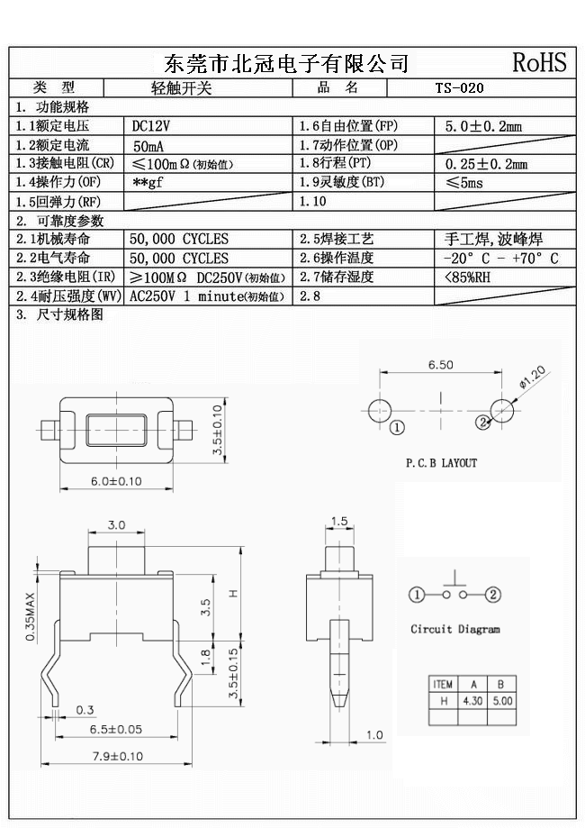 產品名稱:TS-020輕觸開關