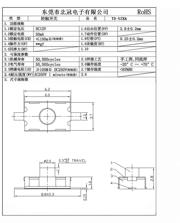 3.Lnsulation Resistance: ≥100mΩ DC250V
