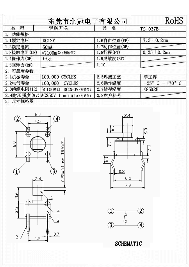 產(chǎn)品名稱:TS-037B輕觸開(kāi)關(guān) Typical Specifications |