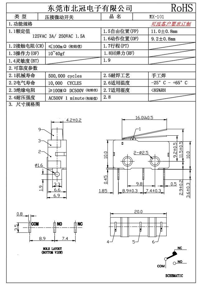3.Lnsulation Resistance: ≥100mΩ DC500V