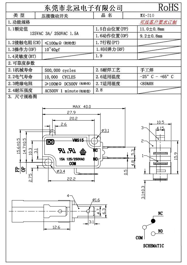 3.Lnsulation Resistance: ≥100mΩ DC500V
