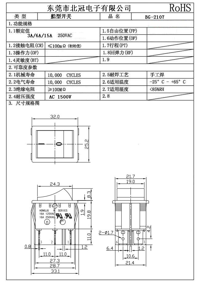 技術參數〔SPECIFICATION〕 額定電流、電壓: 6(4)A 250VAC 6A/125A 250VAC 6A 250VAC/10A 125VAC 接觸電阻:≤20mΩ 絕緣電阻:≥100MΩ 介電強度:≥1800VAC/3S 電器壽命:≥10000次