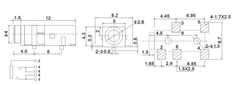 品名:2.5耳機插座 耳機插座技術參數: 1.額定負荷:0.5A 30V DC 2.按觸電阻:100 mΩ max. 3.使用溫度:-20℃~70℃ 4.插拔力:3-20N 5.使用壽命:5,000cycles 耳機插座主要組成部件: 1.塑膠底座 2.磷銅或鈹銅簧片