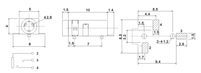 品名:2.5耳機插座 耳機插座技術參數(shù): 1.額定負荷:0.5A 30V DC 2.按觸電阻:100 mΩ max. 3.使用溫度:-20℃~70℃ 4.插拔力:3-20N 5.使用壽命:5,000cycles 耳機插座主要組成部件: 1.塑膠底座 2.磷銅或鈹銅簧片