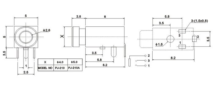 品名:2.5耳機插座 耳機插座技術參數: 1.額定負荷:0.5A 30V DC 2.按觸電阻:100 mΩ max. 3.使用溫度:-20℃~70℃ 4.插拔力:3-20N 5.使用壽命:5,000cycles 耳機插座主要組成部件: 1.塑膠底座 2.磷銅或鈹銅簧片