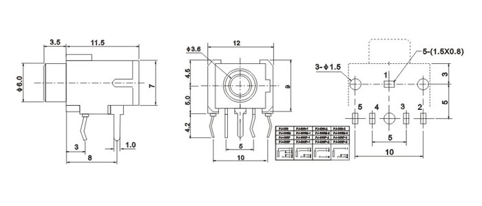 品名:3.5耳機插座 耳機插座技術參數: 1.額定負荷:0.5A 30V DC 2.按觸電阻:100 mΩ max. 3.使用溫度:-20℃~70℃ 4.插拔力:3-20N 5.使用壽命:5,000cycles 耳機插座主要組成部件: 1.塑膠底座 2.磷銅或鈹銅簧片